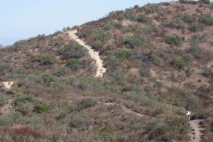 The Brookview Trail is in the South Ranch Open Space, part of the Los Robles Trail system. The photo shows roughly the bottom third of this steep, rocky section of the trail. Among some local mountain bikers, it is affectionately known as the “Descent of Death.” Fortunately it is no longer necessary to risk your life by riding this trail. During the Annual Conejo Trail Work Day in October 2014, a bypass trail was built that has a much more pleasant slope and a decently even tread. Naturally, the bypass is much easier to climb as well.